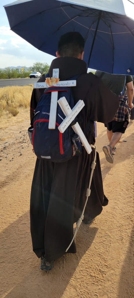 Last week I embarked on a 75 mile walk from the border wall to Tucson known as the Migrant Trail Walk which has a 22 year tradition. I decided to join the walk because of the positive testimonies of Franciscans who walked in recent years. Additionally, I knew that our postulant program would end with a southwest tour so being in Arizona that week fit well in my schedule. After reflecting on the week, which was perhaps the most emotionally and physically draining week of my life, I laugh at those reasons for walking.